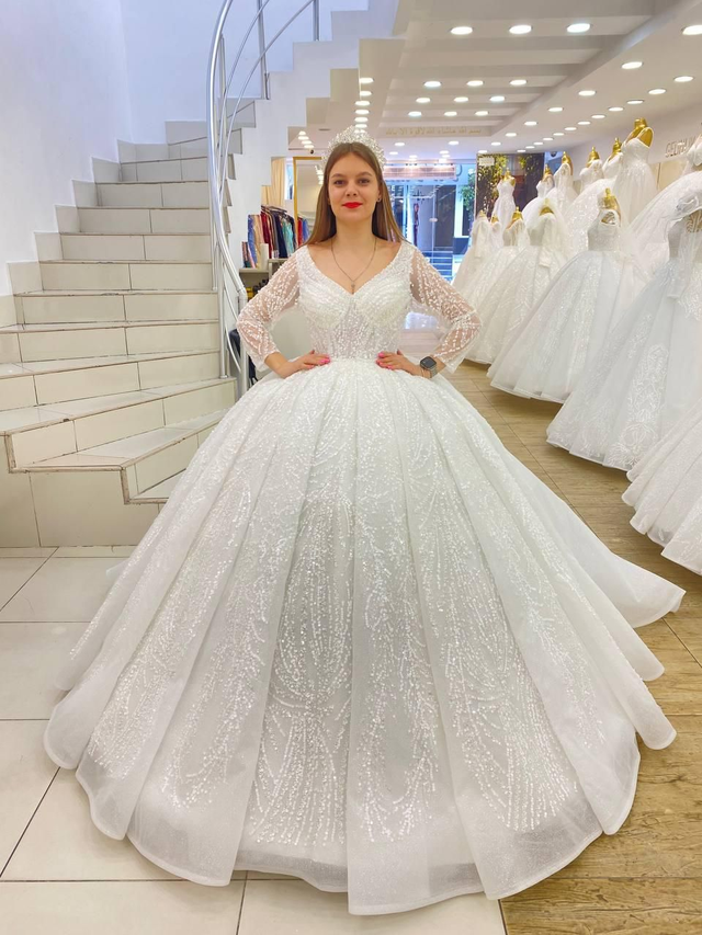 Robe de Mariée Princesse Blanche avec Paillettes Manches longues Col V / Réf : RMP38
