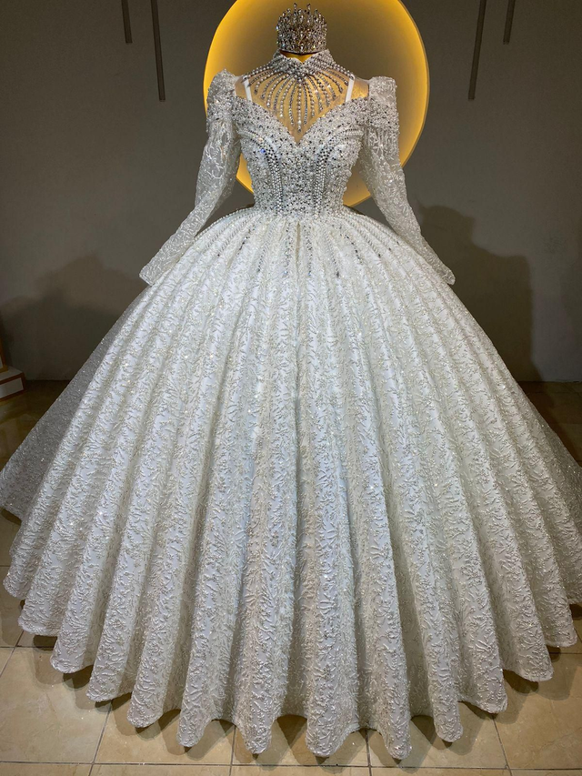 Robe de Mariée Princesse Luxury Brillante avec Perles Paillettes Strass Col V Manches longues / Réf : RMP50