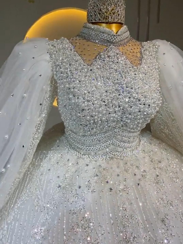 Robe de Mariée Princesse Luxury Col Coeur Bijou Perles Strass Manches longues / Réf : RMP68