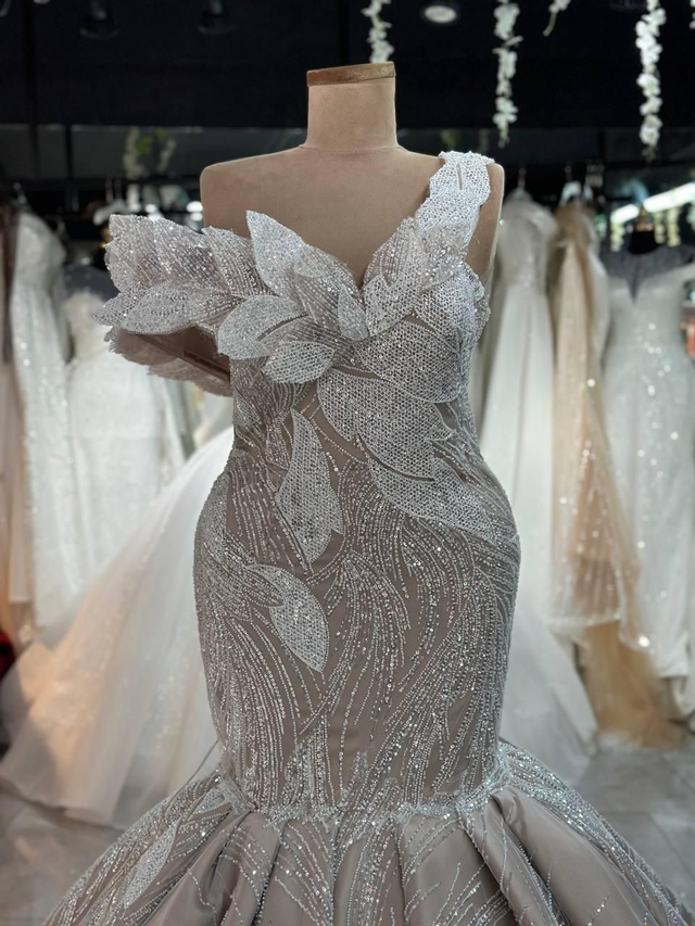 Robe de Mariée Princesse Brillante Motifs Fleurs Épaules Dénudées / Réf : RMP39