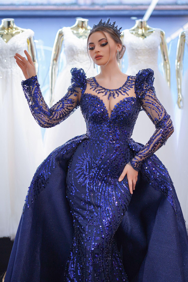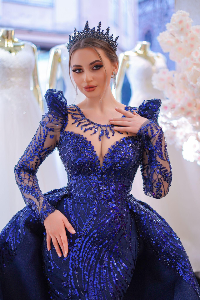 Robe de Mariée Sirène Bleu Col V à Paillettes / Réf : RMS06