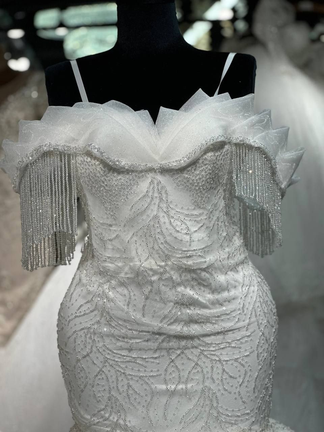 Robe de Mariée Sirène Col Bateau Manche en Perles tombantes / Réf : RMS83