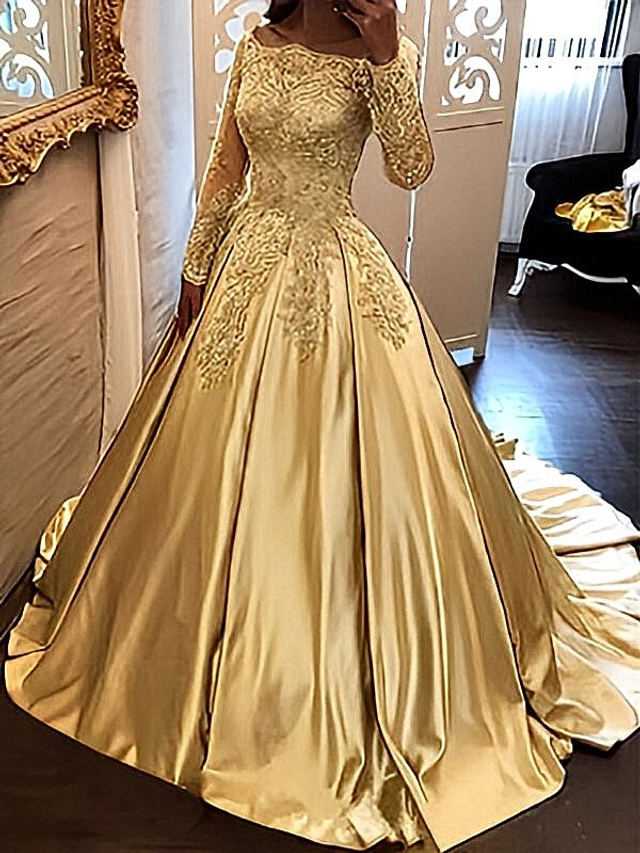 Robe de Soirée Doré Satin Épaules Dénudés / Réf : RMSR02