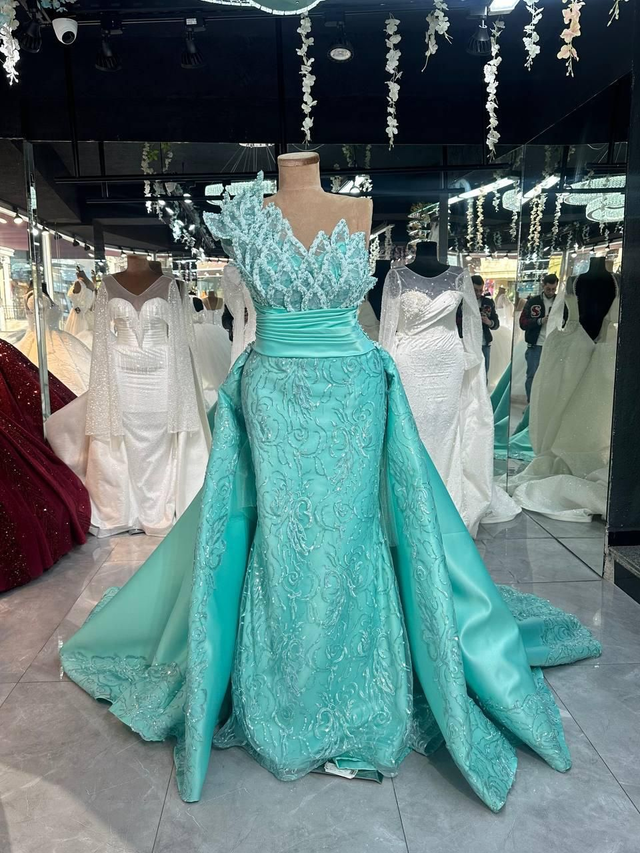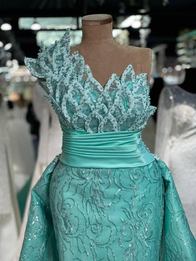 Robe de Soirée Sirène Bleu Turquoise Motifs Fleurs Paillettes / Réf : RMS61